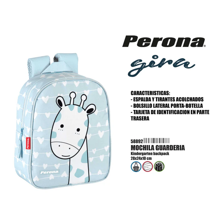 Esta dulce mochila infantil en azul claro está diseñada para acompañar a los pequeños en edad preescolar en todas sus aventuras. Su frontal destaca por una encantadora jirafa en tonos blancos y azules, con detalles tridimensionales que le dan un aspecto tierno y divertido. Las manchas, los grandes ojos y las orejitas en relieve aportan un toque amistoso que enamora al instante. El fondo, decorado con corazones en tonos suaves, completa un diseño alegre y lleno de personalidad.